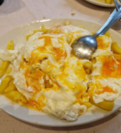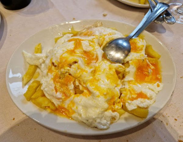 Cocina española tradicional, como huevos estrellados y rabo de toro, en un restaurante pintoresco de 1974.
